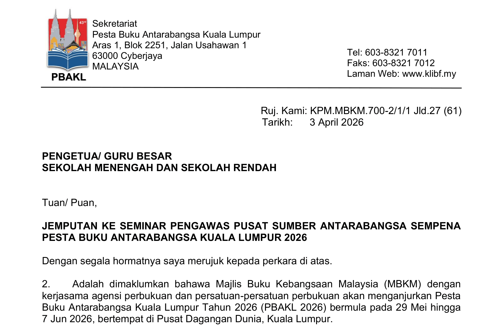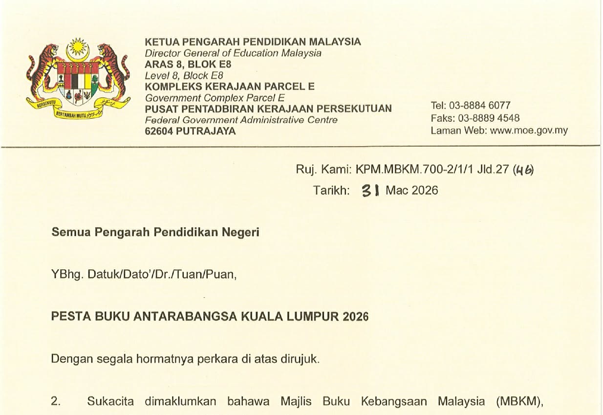 Surat hebahan untuk Pesta Buku Antarabangsa Kuala Lumpur 2026 kepada sekolah-sekolah boleh dimuat turun di sini; . .